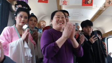 車(chē)廂里,國(guó)家級(jí)非遺沾化漁鼓戲現(xiàn)場(chǎng)開(kāi)唱。旅客們都圍攏過(guò)來(lái),在回家的路上聽(tīng)了一段地道年戲。