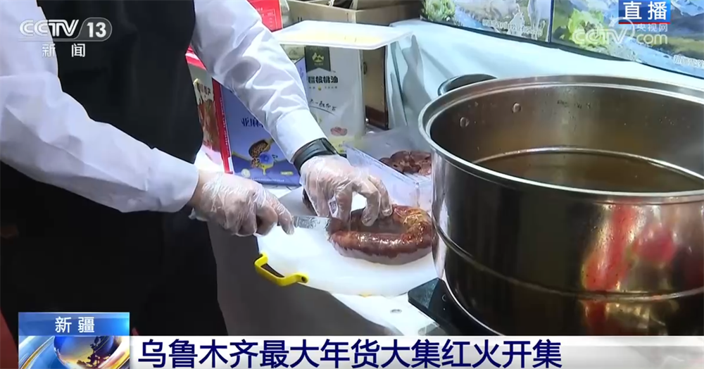 既然是新疆的年貨大集,自然少不了當(dāng)?shù)氐奶厣a(chǎn)品。大家看這一排展示的都是新疆各族百姓春節(jié)前最愛采購的年貨,這是熏馬肉,當(dāng)?shù)匾步凶黢R腸子,熱騰騰的馬肉煮好后是新疆春節(jié)餐桌上妥妥的“硬菜”;此外,還有各類奶制品和其他牛羊肉制品。這兩天采訪中記者了解到,很多在新疆工作的外地朋友都會(huì)在春節(jié)返鄉(xiāng)前選購一些新疆特色年貨帶回老家。怎么樣?這樣的回家禮物是不是很特別?