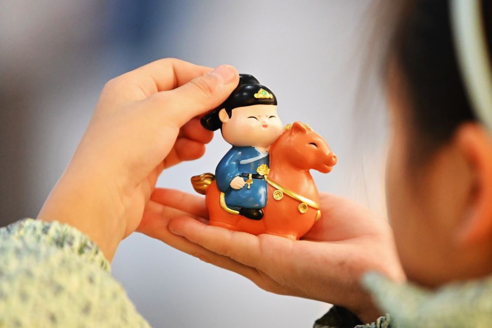 1月17日,在山東滕州博物館文創(chuàng)商店,一名小朋友選購(gòu)“踏馬游春”文創(chuàng)擺件。新華社發(fā)(李志軍 攝)