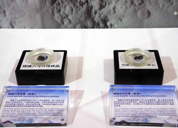 2025年11月5日在第八屆進(jìn)博會國家展中國館拍攝的“嫦娥五號”月壤和“嫦娥六號”月壤。