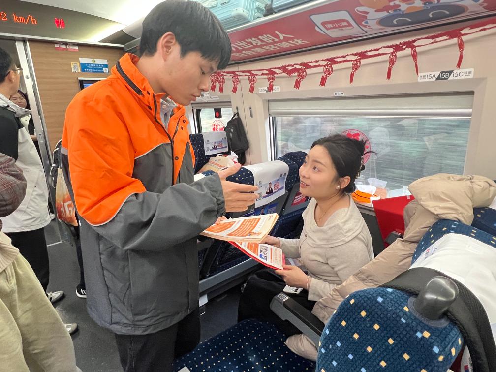 返鄉(xiāng)專列上,一場別開生面的“移動春招會”同步展開。乘客現(xiàn)場掃描二維碼,可查閱到荊門近2.6萬個招聘崗位信息。“老鄉(xiāng)們,要是大家年后想在家門口就業(yè)創(chuàng)業(yè),可以隨時聯(lián)系我們?!鼻G門市人社部門工作人員鄭文杰的一席話,溫暖又親切。