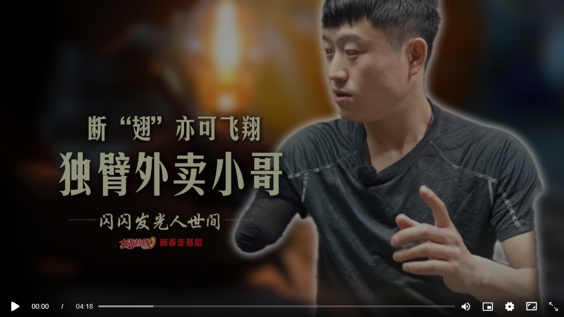 18歲意外失去右臂,不向命運(yùn)低頭,單手騎車、送餐、爬樓,憑著樂觀和韌勁,風(fēng)雨無(wú)阻跑遍阜新街巷。每天工作12小時(shí)、日均配送60單、爬樓100多層、騎行100多公里……
