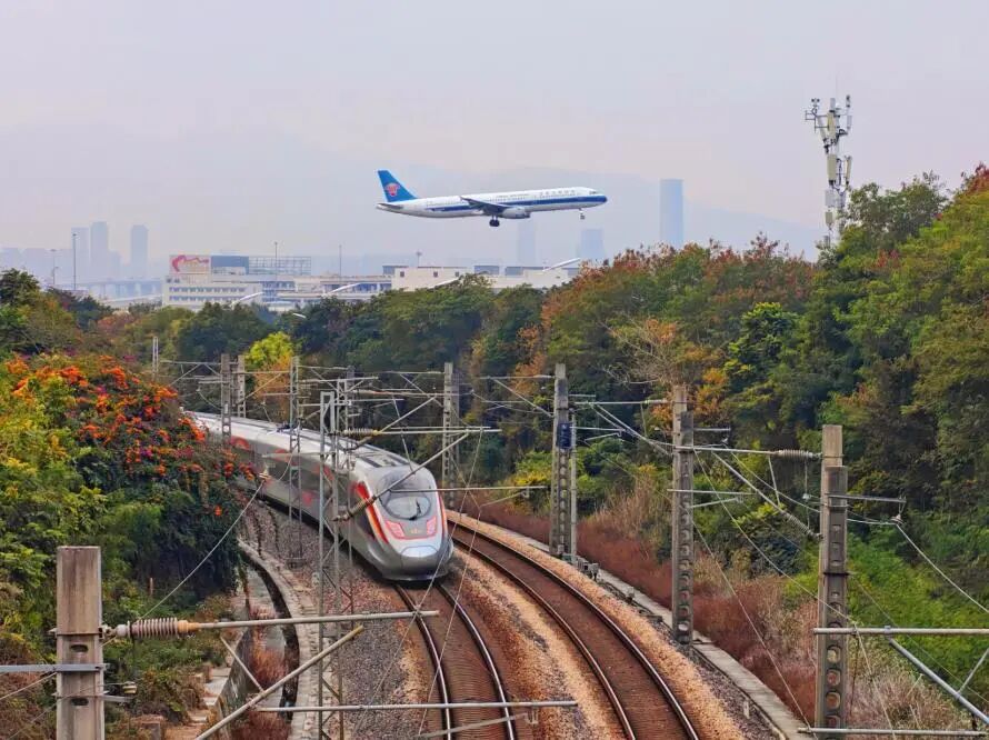 廈門島內(nèi)鷹廈線路上,紅色復(fù)興號與藍(lán)色飛機(jī)同框。
