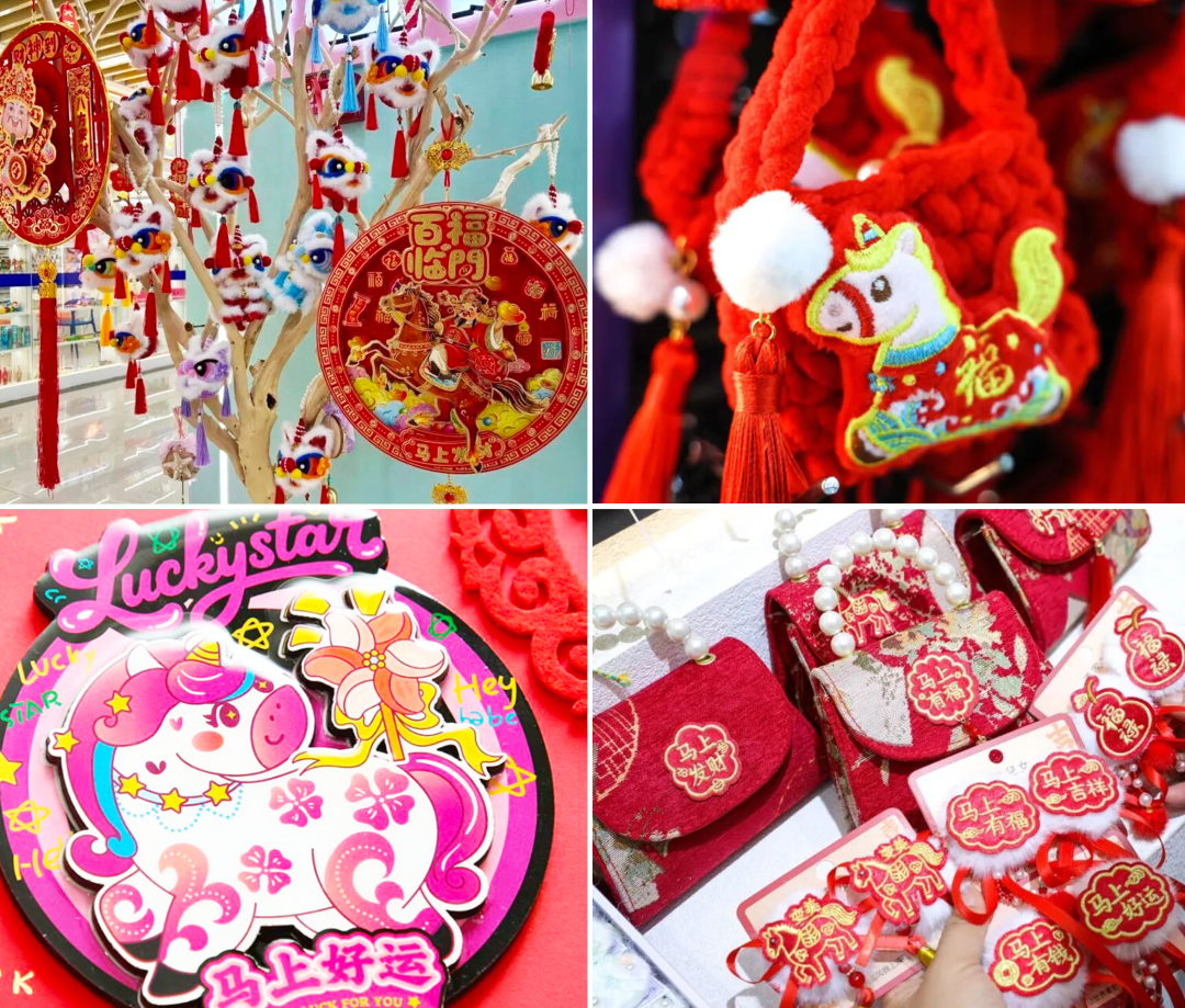 義烏國(guó)際商貿(mào)城年味兒滿(mǎn)滿(mǎn),年畫(huà)、燈籠、馬年玩偶,還有各式各樣的創(chuàng)意潮玩年貨,鋪天蓋地的“中國(guó)紅”,熱熱鬧鬧。