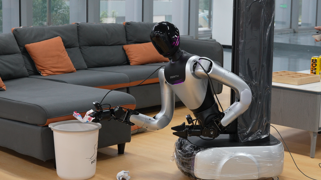 隨著人工智能和具身智能技術(shù)的加速演進(jìn),更具前瞻性的“AI+服務(wù)”探索正在開展。在合肥零次方機(jī)器人有限公司,研發(fā)人員在公共衛(wèi)生間復(fù)刻場景中,訓(xùn)練一款輪臂人形機(jī)器人完成擦桌子、清潔馬桶、疊衣服、使用吸塵器打掃衛(wèi)生等任務(wù)。