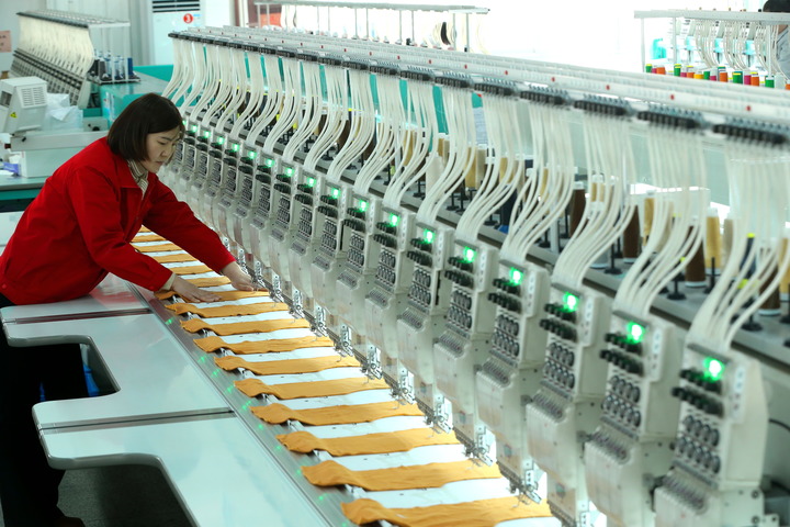 2月22日,山東省青島市即墨區(qū)即發(fā)集團有限公司的工人在繡花生產線上忙碌。新華社發(fā)(梁孝鵬 攝)