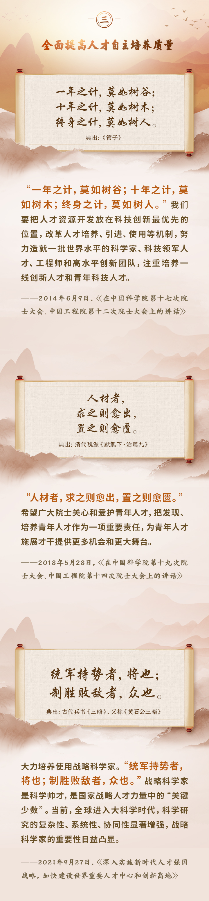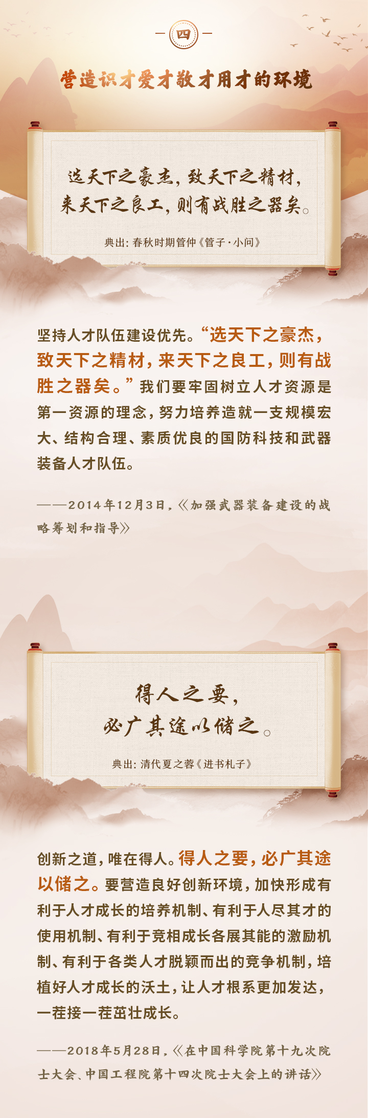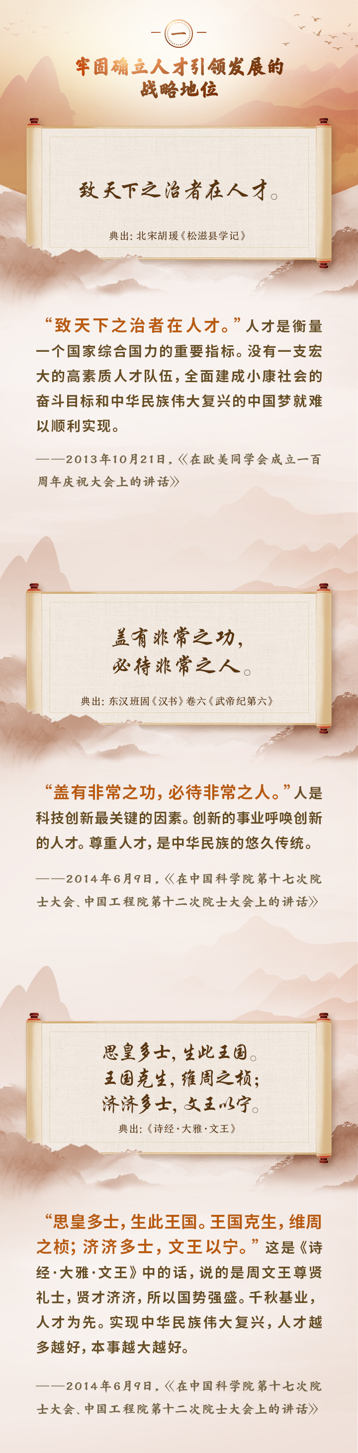 編者按:培養(yǎng)造就大批德才兼?zhèn)涞母咚刭|(zhì)人才,是國家和民族長遠(yuǎn)發(fā)展大計。黨的十八大以來,習(xí)近平總書記圍繞人才工作發(fā)表一系列重要論述,立意高遠(yuǎn),內(nèi)涵豐富,思想深刻,深刻回答了為什么建設(shè)人才強(qiáng)國、什么是人才強(qiáng)國、怎樣建設(shè)人才強(qiáng)國的重大理論和實(shí)踐問題。在這些重要論述中,總書記精妙運(yùn)用古代典籍、經(jīng)典名句,以古喻今、啟迪思想、激蕩精神,讓我們一起來學(xué)習(xí)!
