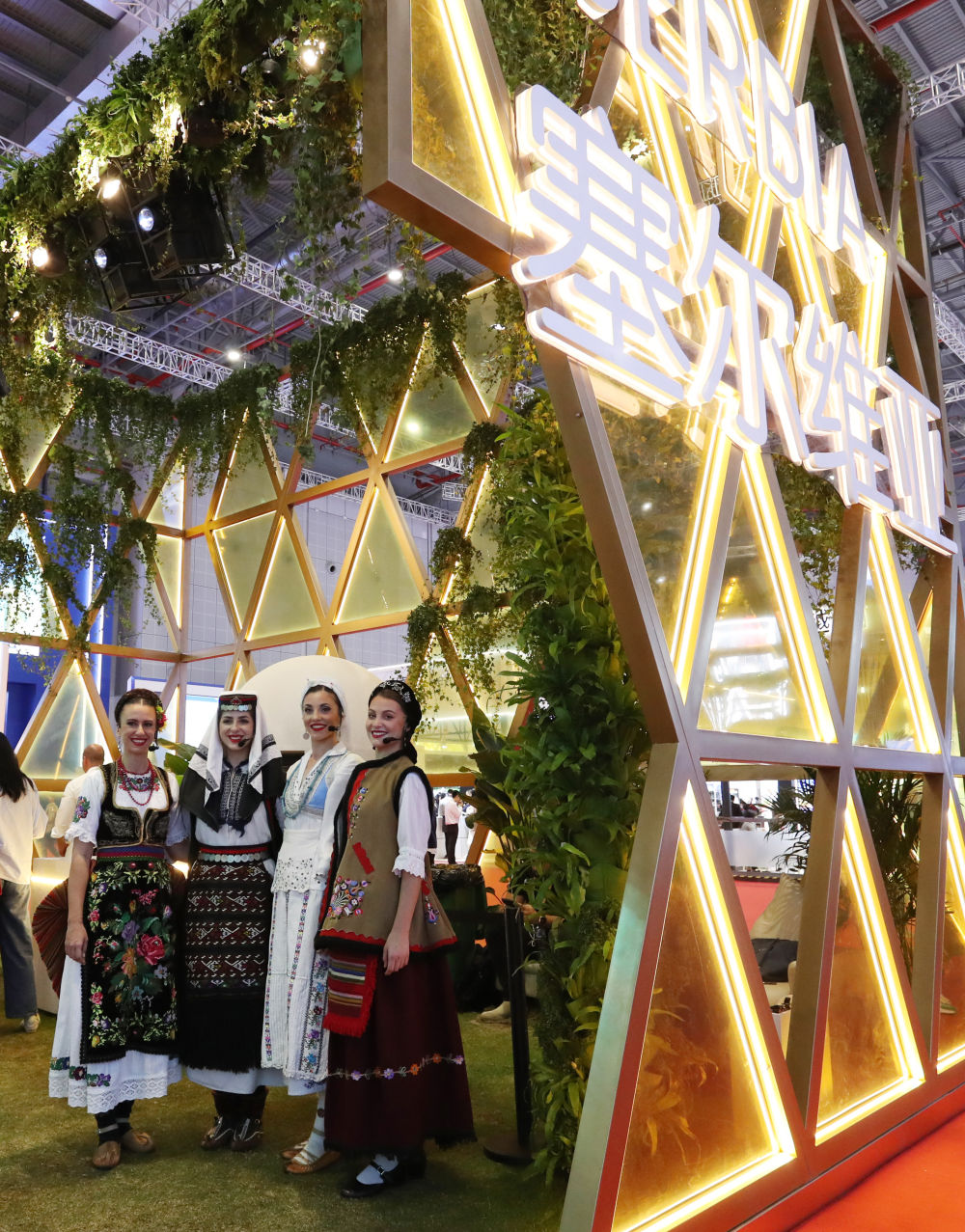 2023年11月6日,身著傳統(tǒng)服飾的演職人員在上海進博會國家展塞爾維亞展臺迎接參觀者。第六屆進博會國家展全面恢復(fù)線下舉辦,洪都拉斯、塞爾維亞、越南、南非、哈薩克斯坦作為本屆進博會主賓國在國家展亮相。新華社記者 方喆 攝