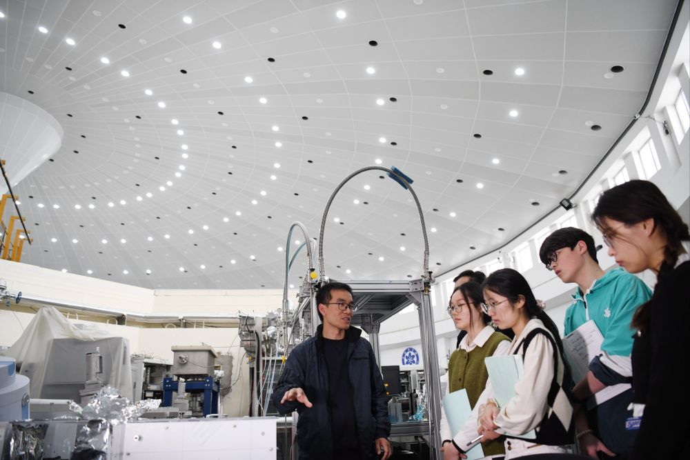在中國科學(xué)技術(shù)大學(xué)國家同步輻射實(shí)驗(yàn)室,安徽省先進(jìn)功能高分子薄膜工程實(shí)驗(yàn)室團(tuán)隊(duì)成員崔昆朋教授(左一)同學(xué)生交流(2024年4月6日攝)。新華社記者 張端 攝