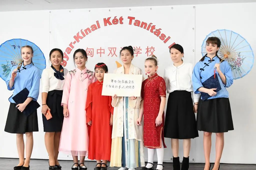 在匈牙利布達佩斯的匈中雙語學校,師生們在復信轉交儀式后手持“努力做傳承發(fā)展中匈友好事業(yè)的使者”的標語合影。(圖源:新華社)