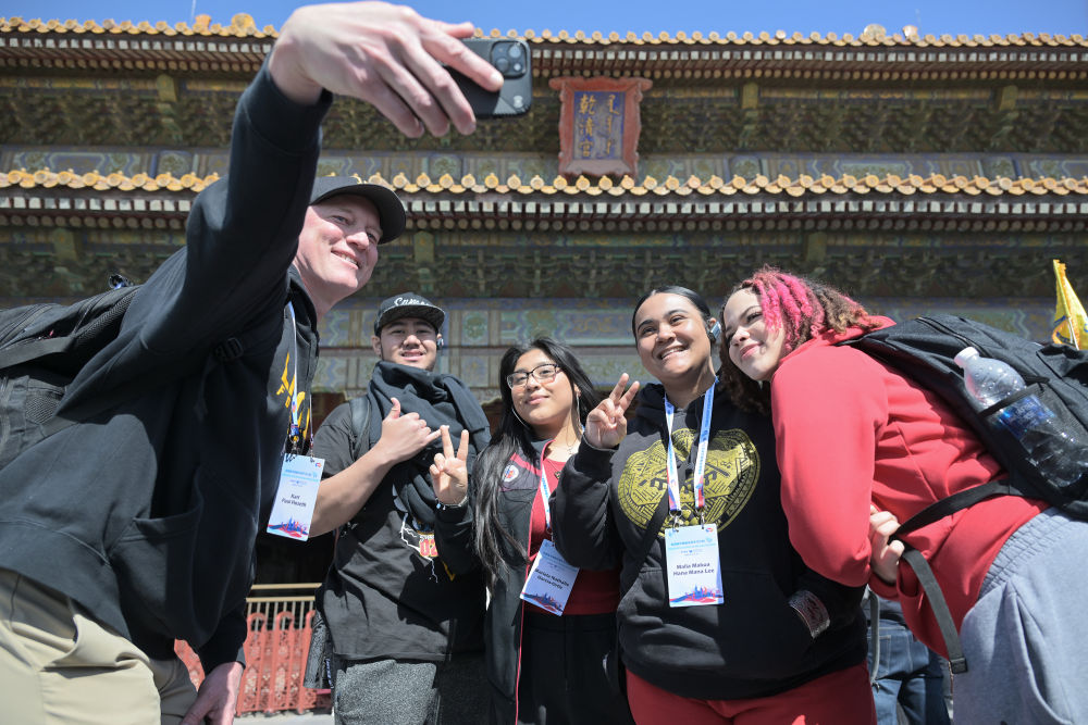 2024年3月19日,美國華盛頓州中學(xué)生代表團(tuán)的成員在故宮乾清宮前合影留念?! ⌒氯A社記者 李鑫 攝