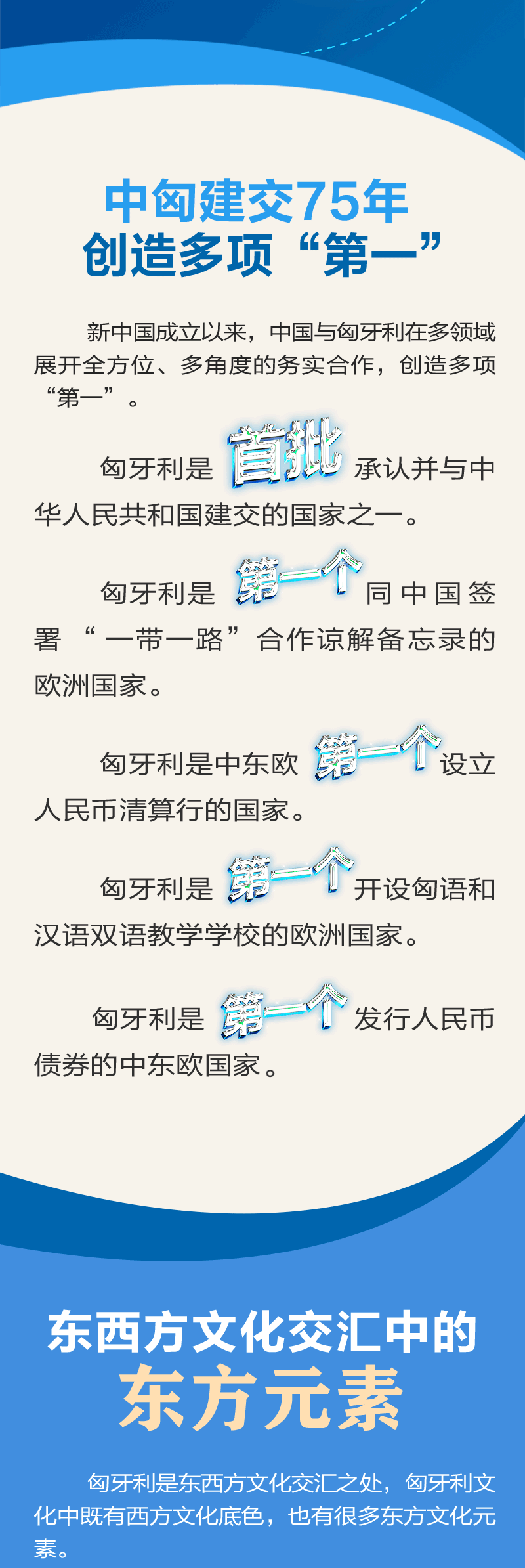 中國與匈牙利的傳統(tǒng)友誼源遠流長。建交75年來,雙方在國際事務中相互支持、密切配合。近年來,在兩國領(lǐng)導人的戰(zhàn)略引領(lǐng)下,中匈關(guān)系始終保持高水平發(fā)展。雙方政治互信不斷加深,互利合作成果豐碩,人文交流豐富多彩,在國際和地區(qū)事務中協(xié)作良好。