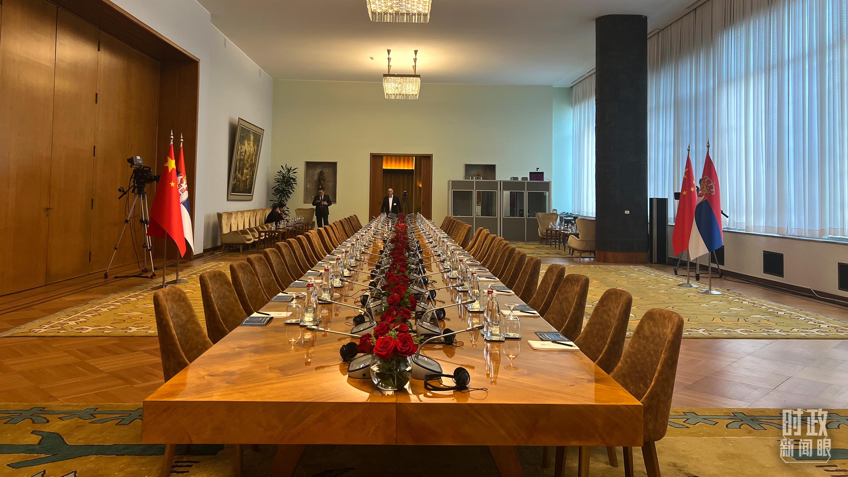 5月8日上午,習主席同武契奇總統(tǒng)舉行大范圍會談,這是會談開始前的現(xiàn)場。(總臺央視記者張洛嘉拍攝)