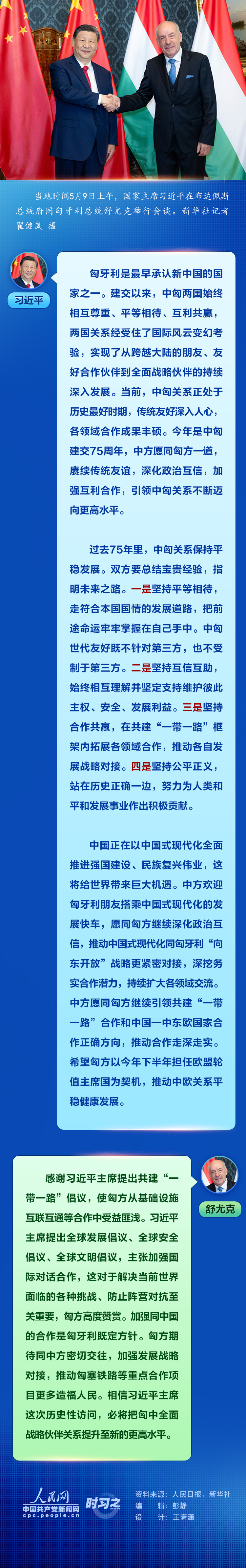 當地時間5月9日上午,國家主席習近平在布達佩斯總統(tǒng)府同匈牙利總統(tǒng)舒尤克舉行會談。習近平指出,今年是中匈建交75周年,中方愿同匈方一道,賡續(xù)傳統(tǒng)友誼,深化政治互信,加強互利合作,引領中匈關系不斷邁向更高水平。