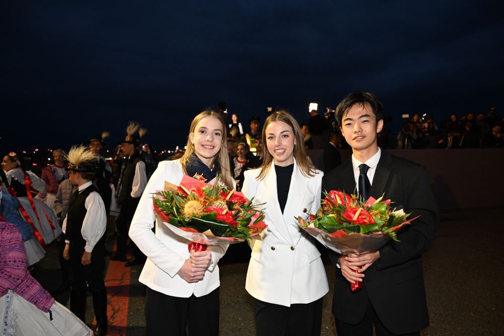 當(dāng)?shù)貢r間5月8日晚,在匈牙利布達(dá)佩斯國際機(jī)場,匈牙利姑娘歐拉·塔瑪拉與匈中雙語學(xué)校兩名參加歡迎儀式的學(xué)生合影。新華社記者謝環(huán)馳攝