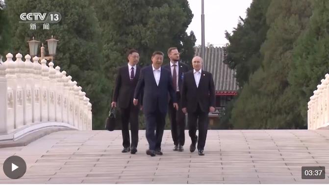 習(xí)近平在瀛臺橋前迎接普京。兩國元首邊走邊談,看亭臺樓榭,賞萬物并秀。