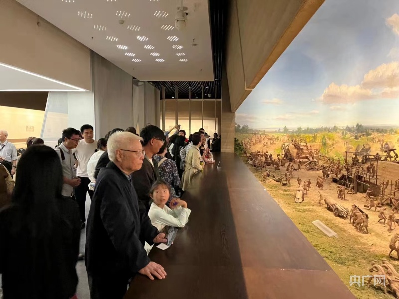 游客在鄭州商代都城遺址博物院觀看筑城場景復(fù)原(央廣網(wǎng)發(fā) 馬玉鵬 攝)
