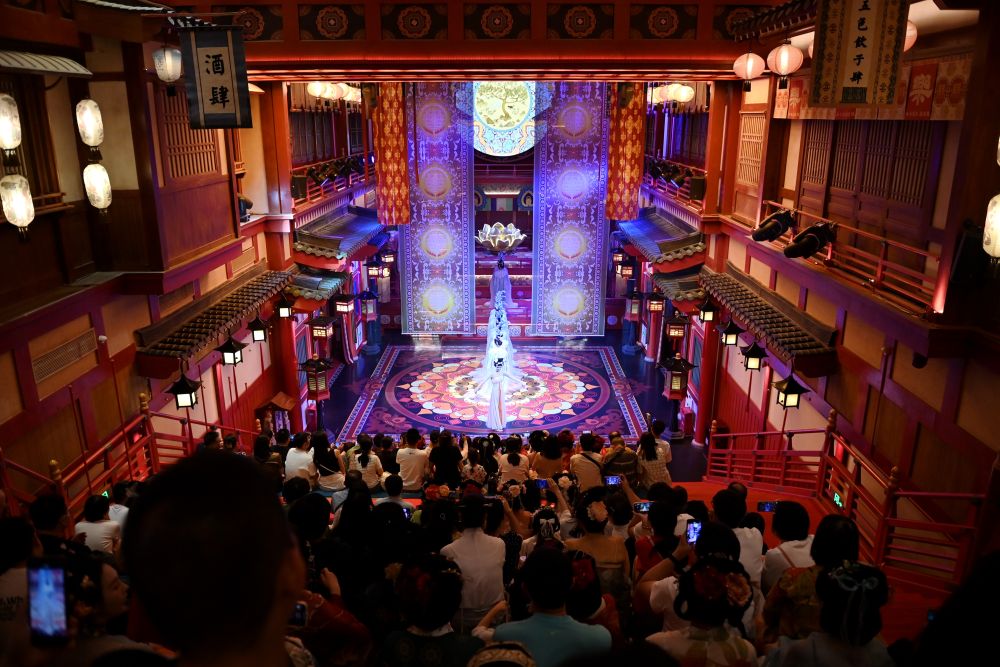 2024年5月12日,游客在西安長(zhǎng)安十二時(shí)辰主題街區(qū)內(nèi)觀看演出。新華社記者 李一博 攝