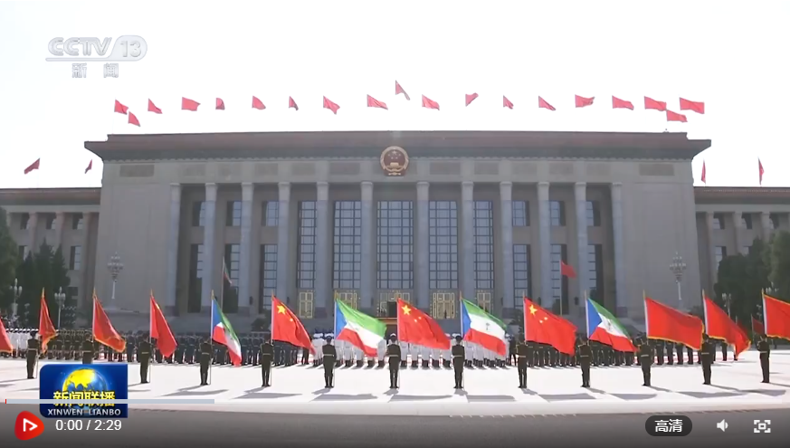 奧比昂抵達(dá)時(shí),禮兵列隊(duì)致敬。兩國元首登上檢閱臺(tái),軍樂團(tuán)奏中赤幾兩國國歌,天安門廣場鳴放21響禮炮。奧比昂在習(xí)近平陪同下檢閱中國人民解放軍儀仗隊(duì),并觀看分列式。