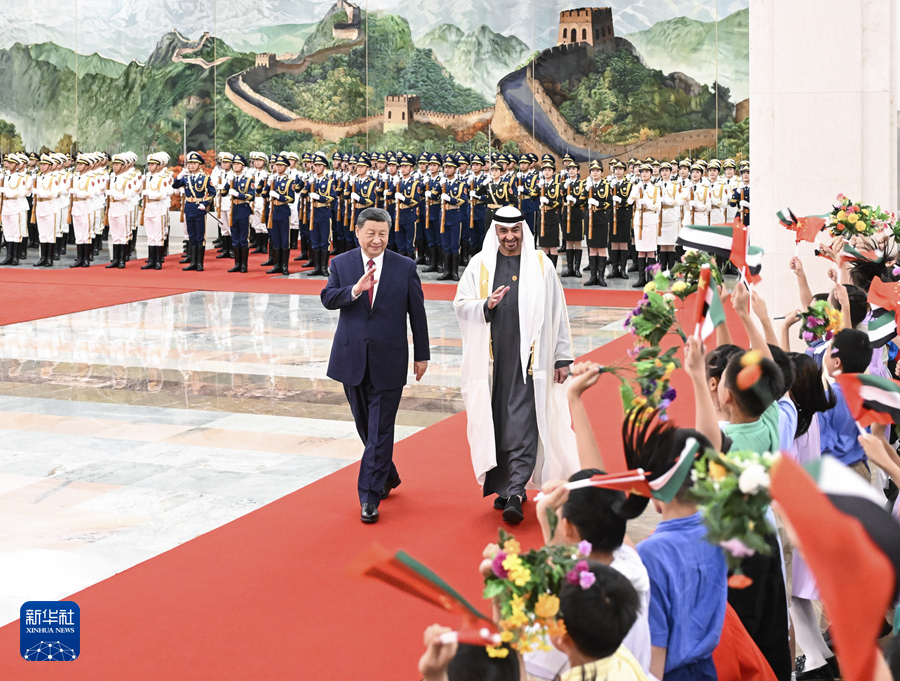 5月30日下午,國(guó)家主席習(xí)近平在北京人民大會(huì)堂同來(lái)華國(guó)事訪問(wèn)并出席中國(guó)-阿拉伯國(guó)家合作論壇第十屆部長(zhǎng)級(jí)會(huì)議開(kāi)幕式的阿聯(lián)酋總統(tǒng)穆罕默德舉行會(huì)談。這是會(huì)談前,習(xí)近平在人民大會(huì)堂北大廳為穆罕默德舉行歡迎儀式。新華社記者 饒愛(ài)民 攝