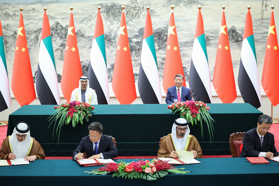 5月30日下午,國(guó)家主席習(xí)近平在北京人民大會(huì)堂同來(lái)華國(guó)事訪問(wèn)并出席中國(guó)-阿拉伯國(guó)家合作論壇第十屆部長(zhǎng)級(jí)會(huì)議開(kāi)幕式的阿聯(lián)酋總統(tǒng)穆罕默德舉行會(huì)談。這是會(huì)談后,兩國(guó)元首共同見(jiàn)證簽署多項(xiàng)雙邊合作文件。新華社記者 劉彬 攝
