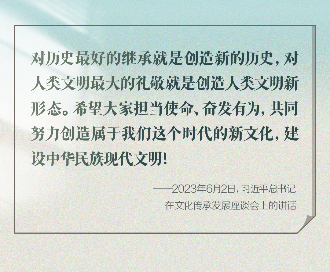 2023年6月2日,習(xí)近平總書(shū)記在文化傳承發(fā)展座談會(huì)上強(qiáng)調(diào):“在新的起點(diǎn)上繼續(xù)推動(dòng)文化繁榮、建設(shè)文化強(qiáng)國(guó)、建設(shè)中華民族現(xiàn)代文明,是我們?cè)谛聲r(shí)代新的文化使命?!?/p>