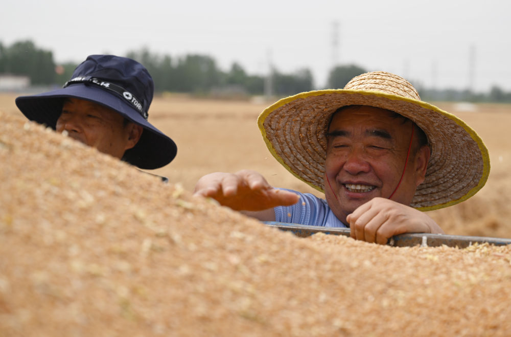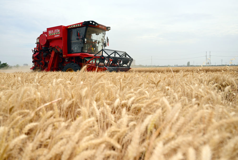 麥收時節(jié),在安徽阜陽太和縣,機器轟鳴,麥浪翻滾如金色綢緞,飽滿的麥粒裝滿一輛輛運糧車的貨廂。