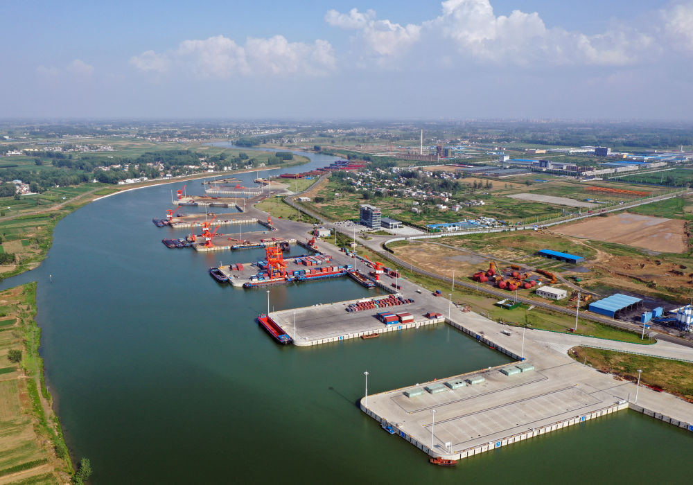 2022年6月28日拍攝的河南周口中心港碼頭(無人機(jī)照片)。近年來,河南積極推進(jìn)沙潁河航道升級(jí)改造,疏通內(nèi)河航運(yùn)?,F(xiàn)在,從周口中心港出發(fā)的船舶可經(jīng)沙潁河至淮河、京杭大運(yùn)河駛?cè)腴L(zhǎng)江,讓內(nèi)陸城市亦能通江達(dá)海。