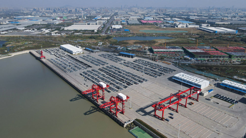 2024年5月26日,在安徽蕪湖港朱家橋港區(qū)國(guó)際集裝箱碼頭,整齊排列的汽車等待出口(無人機(jī)照片)。作為安徽省首個(gè)國(guó)家一類開放口岸,蕪湖港現(xiàn)已發(fā)展成為長(zhǎng)三角城市群綜合交通運(yùn)輸體系的重要樞紐。