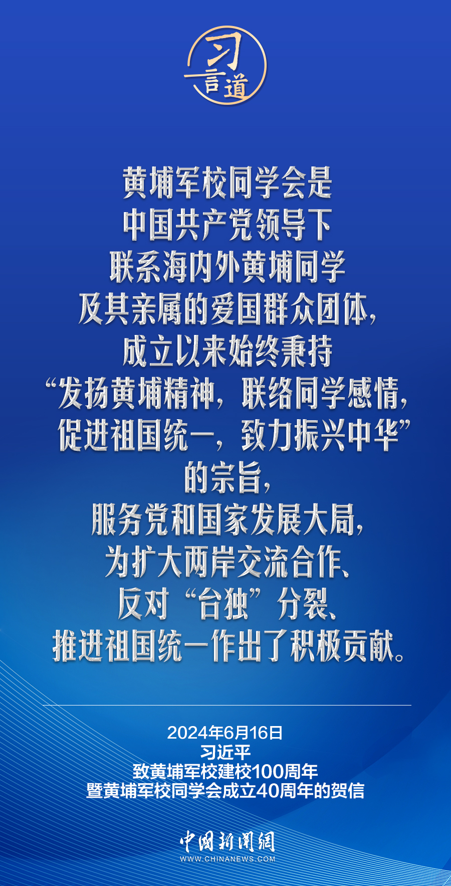 在黃埔軍校建校100周年暨黃埔軍校同學(xué)會成立40周年之際,中共中央總書記、國家主席、中央軍委主席習(xí)近平發(fā)來賀信,代表中共中央向黃埔軍校同學(xué)會表示熱烈祝賀,向廣大海內(nèi)外黃埔同學(xué)及其親屬致以誠摯問候。習(xí)近平指出——