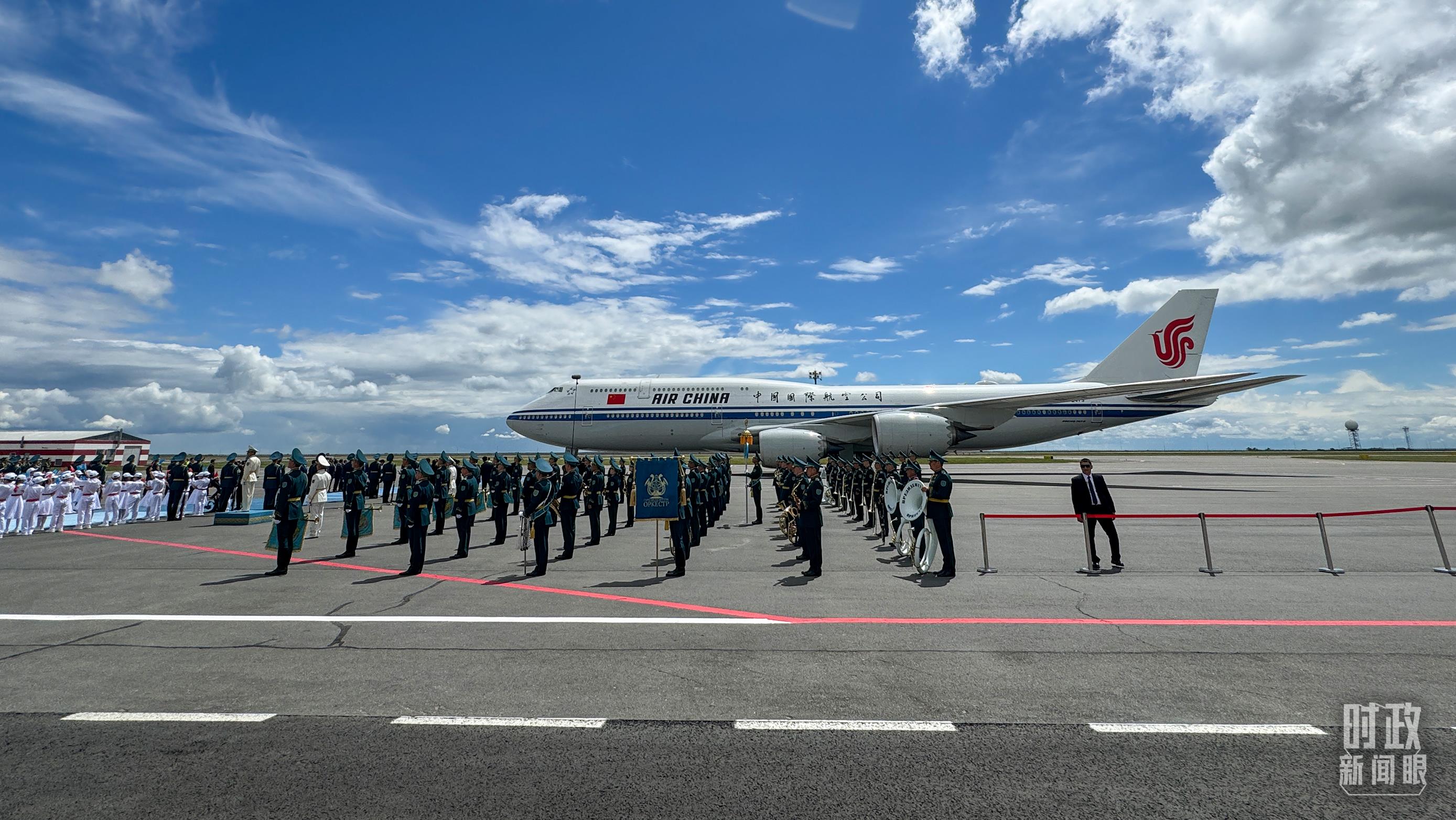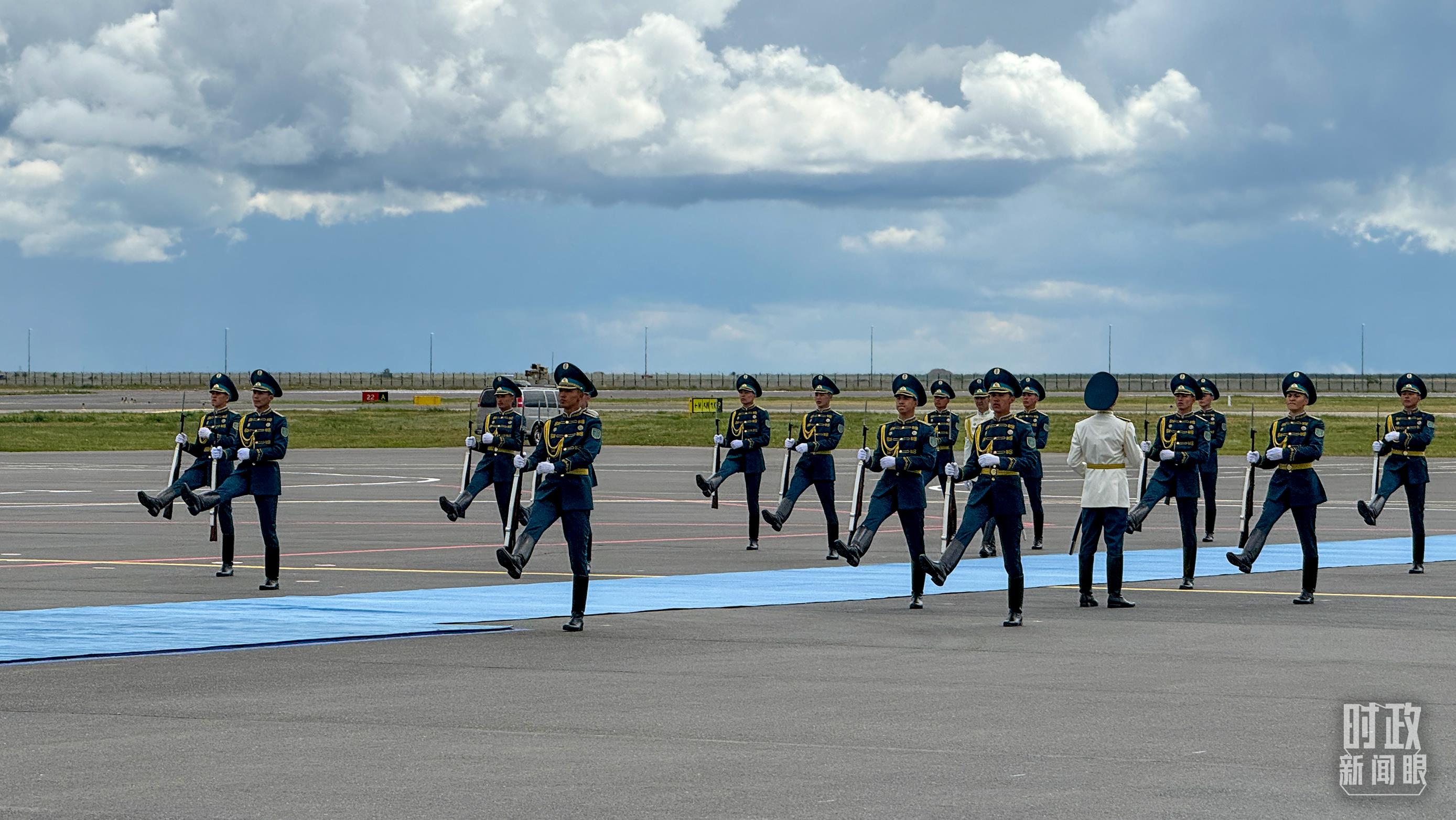 當(dāng)習(xí)近平主席乘坐的專機進入哈薩克斯坦領(lǐng)空時,哈薩克斯坦三架空軍戰(zhàn)機升空護航。專機抵達阿斯塔納納扎爾巴耶夫國際機場時,托卡耶夫總統(tǒng)率政府第一副總理等高級官員熱情迎接。