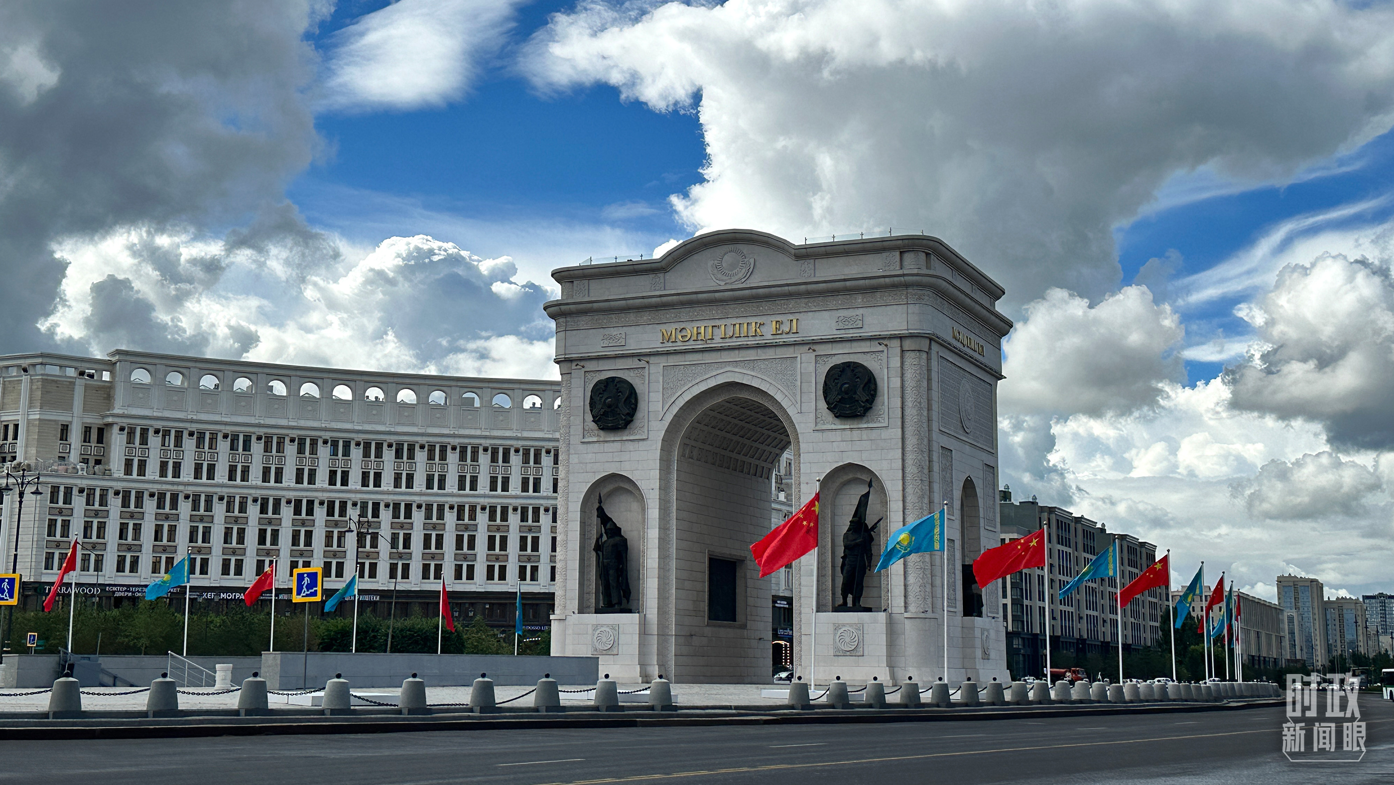 阿斯塔納地標(biāo)建筑“凱旋門(mén)”兩側(cè),中哈兩國(guó)國(guó)旗迎風(fēng)招展。(總臺(tái)央視記者關(guān)舟拍攝)
