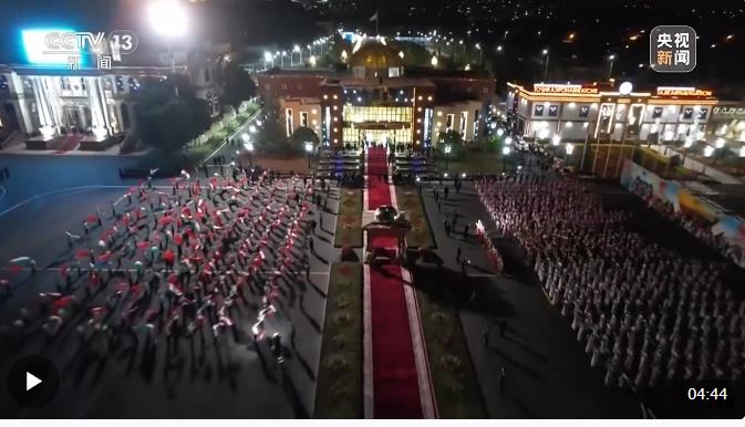 1500多名身著民族盛裝的塔吉克斯坦青年表演富有濃郁特色的中塔歌舞,揮舞中塔兩國(guó)國(guó)旗,表達(dá)對(duì)中國(guó)最尊貴客人的熱烈歡迎。