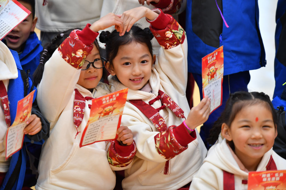 在湖南省長沙市天心區(qū)的湖南師大附中雙語實驗學(xué)校,一年級學(xué)生在趣味闖關(guān)活動中展示自己的闖關(guān)卡片(2024年1月18日攝)。新華社記者 陳澤國 攝