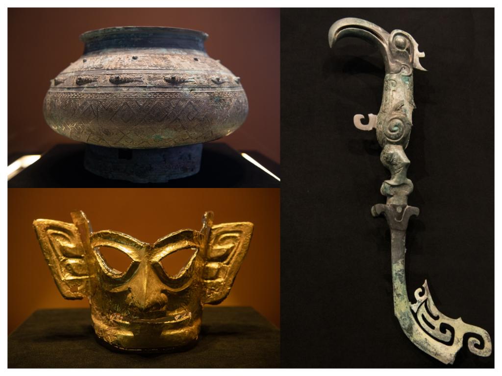 拼版照片:左上圖為青銅瓿,左下圖為黃金面具,右圖為青銅樹枝。新華社記者唐文豪 攝