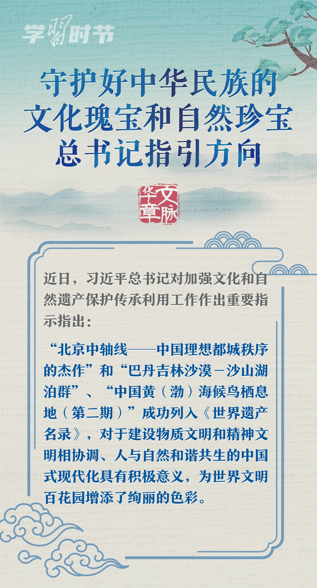 文化遺產(chǎn)體現(xiàn)了中華民族旺盛的生命力和創(chuàng)造力,自然遺產(chǎn)昭示了神奇的自然造化同中華民族的和諧依存關(guān)系。習近平總書記一直以來高度重視文化和自然遺產(chǎn)保護傳承利用工作,近日專門就此作出重要指示強調(diào),守護好中華民族的文化瑰寶和自然珍寶,讓文化和自然遺產(chǎn)在新時代煥發(fā)新活力綻放新光彩。讓我們一同學習。