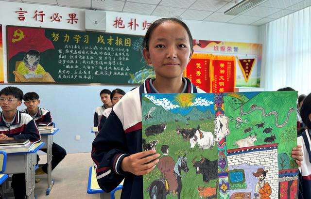 △果洛西寧民族中學學生尼東拉毛在主題思政課上展示表現(xiàn)現(xiàn)代化家鄉(xiāng)的作品。