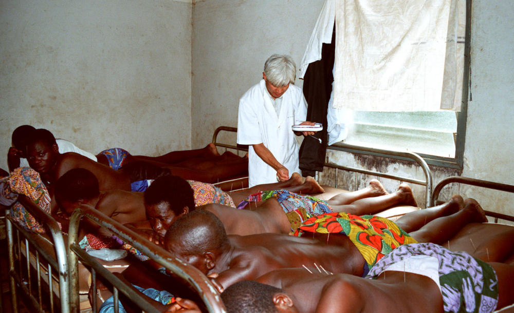 1995年,中國(guó)醫(yī)生在多哥卡拉地區(qū)醫(yī)院門診部為患者進(jìn)行針灸治療。
