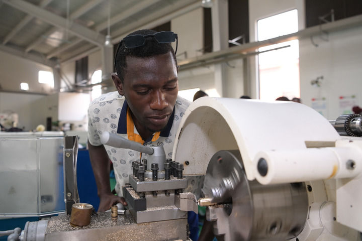 2023年1月10日,在加蓬首都利伯維爾的恩考克經(jīng)濟特區(qū),恩考克國際職業(yè)教育和培訓中心(由中國航空技術(shù)國際控股有限公司聯(lián)合成都航空職業(yè)技術(shù)學院等院校共建)的學生進行車削加工操作訓練。新華社記者 韓旭 攝