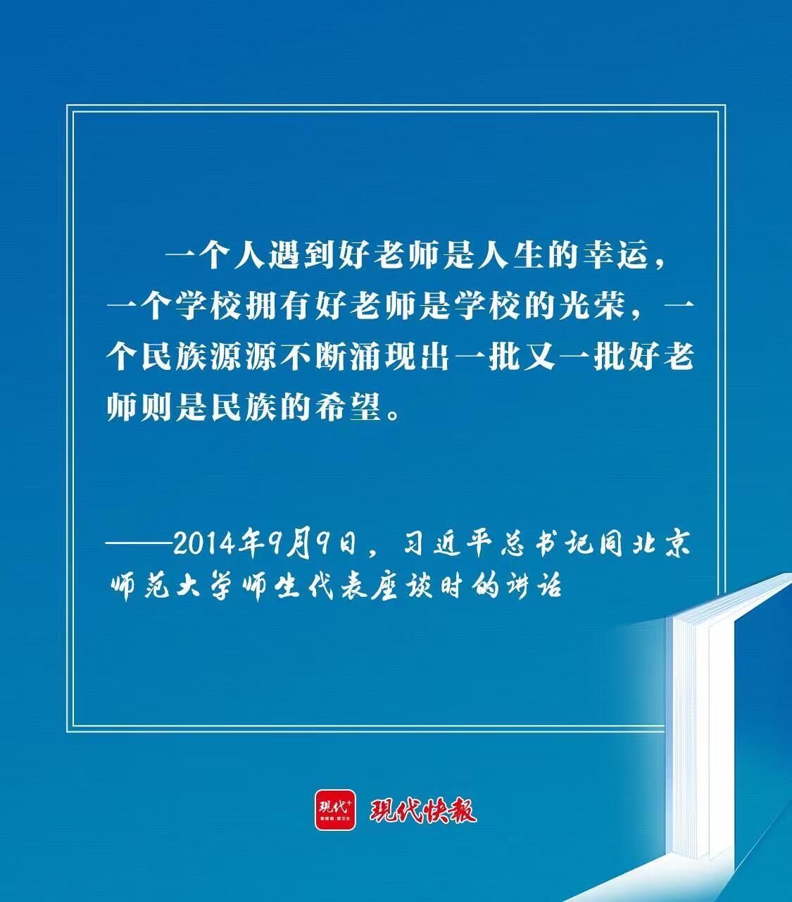 “一個人遇到好老師是人生的幸運,一個學校擁有好老師是學校的光榮,一個民族源源不斷涌現出一批又一批好老師則是民族的希望?!?014年教師節(jié)前夕,同北京師范大學師生代表座談時,習近平總書記的殷殷期盼,激勵廣大教師為民族復興拼搏奮斗。
