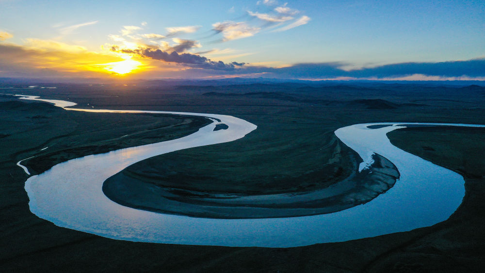 2024年7月31日在青海省果洛藏族自治州達(dá)日縣境內(nèi)拍攝的黃河(無人機(jī)全景照片)。