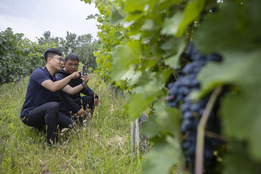 2024年8月15日,技術(shù)人員(左)和工作人員在寧夏銀川市西夏區(qū)的一個(gè)葡萄園工作。為推動(dòng)黃河流域生態(tài)保護(hù)和高質(zhì)量發(fā)展先行區(qū)建設(shè),銀川市積極打造高標(biāo)準(zhǔn)葡萄園,借助各種傳感器監(jiān)測釀酒葡萄的生長狀態(tài),實(shí)現(xiàn)精準(zhǔn)灌溉,從而高效節(jié)約黃河水。