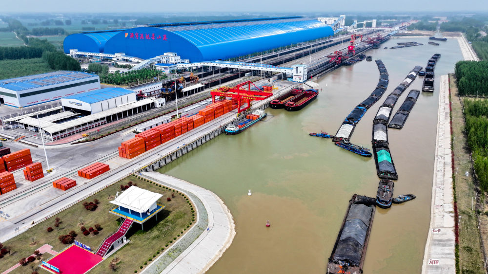 2024年4月24日,船舶行駛在山東濟(jì)寧港航梁山港航道上(無人機(jī)照片)。近年來,山東省加快構(gòu)建沿黃陸海大通道,有效促進(jìn)黃河流域各省區(qū)物流降本增效,實(shí)現(xiàn)更高水平對外開放。
