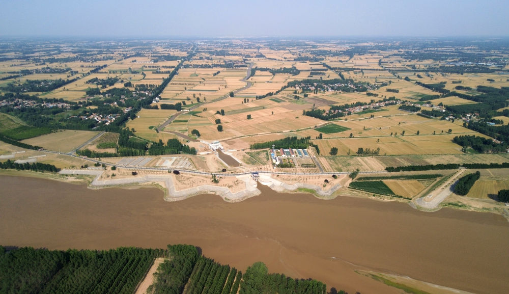 2024年6月19日,位于黃河高青段的馬扎子引黃閘開閘引水(無人機(jī)照片)。5月1日至6月18日,山東省累計(jì)啟用引黃閘63座,引黃河水量10.06億立方米,保障農(nóng)業(yè)灌溉需求。