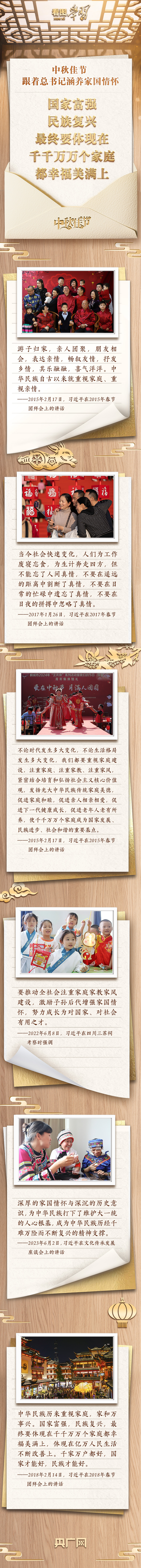 每逢佳節(jié)倍思親。中華民族自古以來(lái)便有重視家庭、家國(guó)一體的情懷。黨的十八大以來(lái),習(xí)近平總書記提出以人民為中心的發(fā)展思想,把人民對(duì)美好生活的向往作為奮斗目標(biāo),注重加強(qiáng)家庭家教家風(fēng)建設(shè),以小家庭的和睦美滿促進(jìn)國(guó)家社會(huì)和諧穩(wěn)定。
