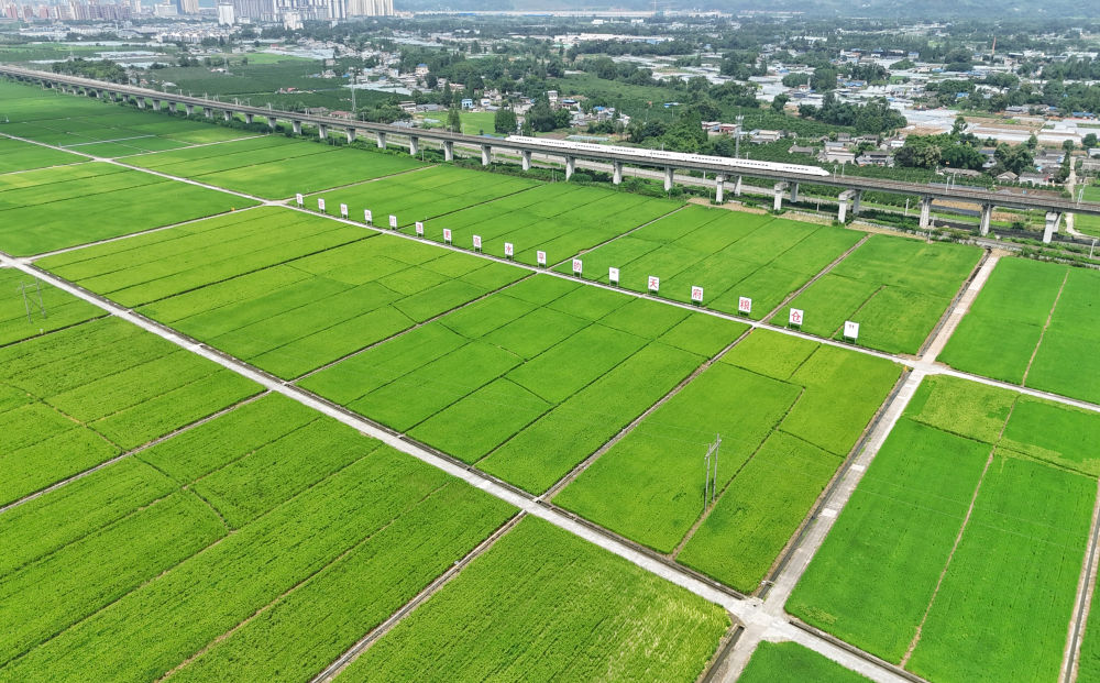 2024年7月26日,一列高鐵列車從永豐村高標(biāo)準(zhǔn)農(nóng)田上方的高架橋上疾馳而過(無人機(jī)照片)。過去,永豐村的農(nóng)田不少是“巴掌田”“雞爪田”,如今,細(xì)碎零散的耕地變成了“田成方、土成型、渠成網(wǎng)、路相通、溝相連”的高標(biāo)準(zhǔn)農(nóng)田,連片農(nóng)田實(shí)現(xiàn)了全程機(jī)械化種植。