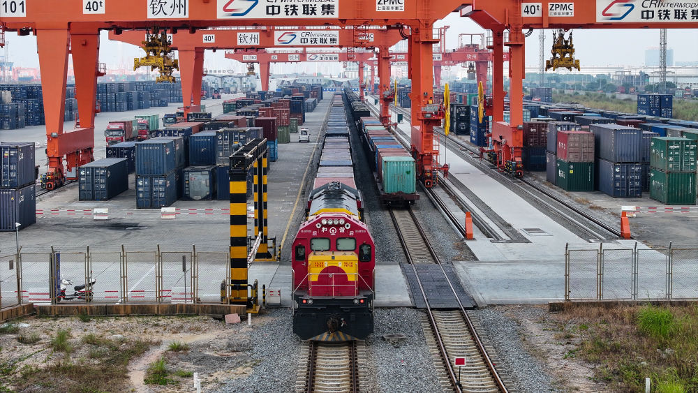 西部陸海新通道鐵海聯(lián)運(yùn)班列從欽州港東站駛出(2024年5月12日攝,無人機(jī)照片)。隨著中國-東盟開放平臺(tái)建設(shè)向縱深推進(jìn),西部陸海新通道正在成為釋放開放活力的強(qiáng)力新引擎,以物流為切入口,促進(jìn)資金、資源、人員、技術(shù)等生產(chǎn)要素深度融合。