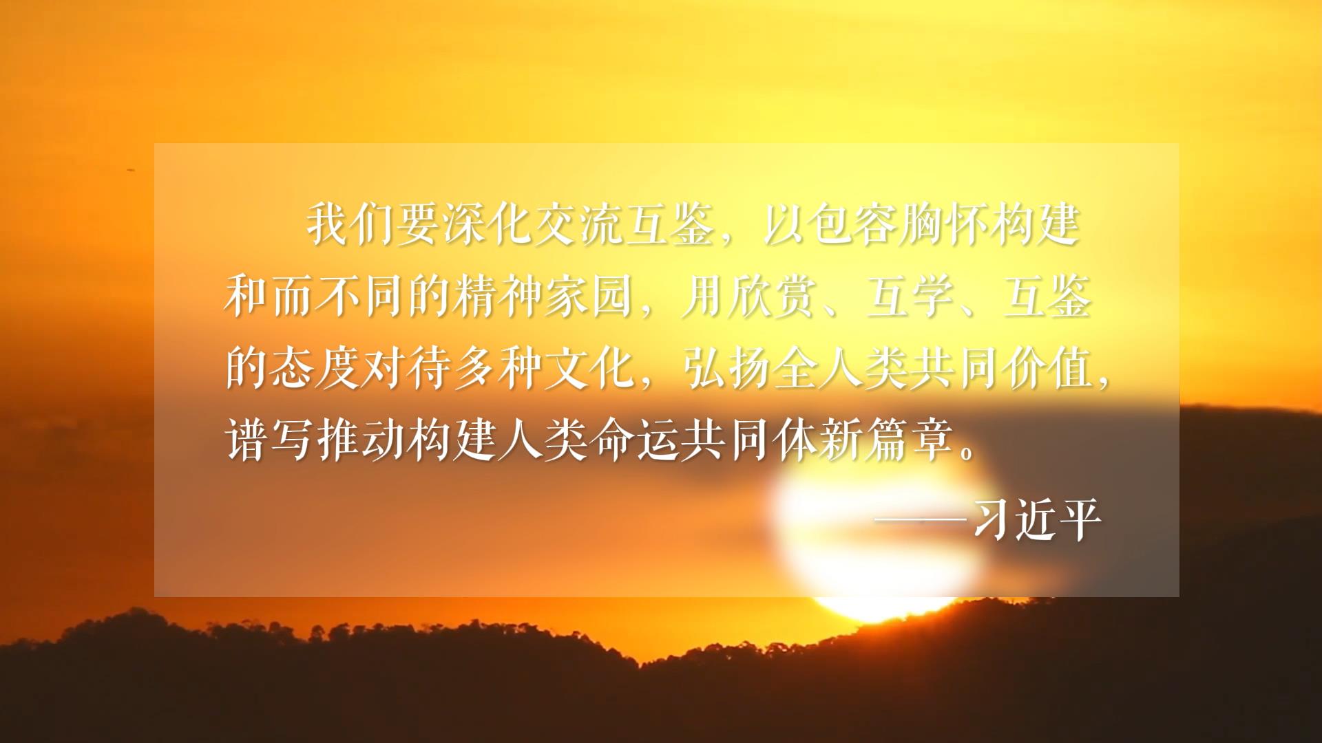我們要深化交流互鑒,以包容胸懷構(gòu)建和而不同的精神家園,用欣賞、互學(xué)、互鑒的態(tài)度對待多種文化,弘揚(yáng)全人類共同價(jià)值,譜寫推動(dòng)構(gòu)建人類命運(yùn)共同體新篇章。