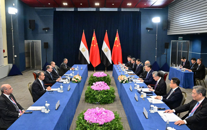 習(xí)近平祝賀并歡迎埃及首次作為正式成員參加金磚國家領(lǐng)導(dǎo)人會晤。習(xí)近平指出,今年是“中埃伙伴年”和兩國建立全面戰(zhàn)略伙伴關(guān)系10周年。中方堅定支持埃及維護國家主權(quán)、安全、發(fā)展利益,愿同埃方做守望相助的真誠朋友、攜手發(fā)展的親密伙伴。雙方要繼續(xù)堅定相互支持,鞏固政治互信,深化務(wù)實合作,高質(zhì)量共建“一帶一路”,密切人文交流,推動雙邊關(guān)系朝著構(gòu)建面向新時代的中埃命運共同體目標(biāo)持續(xù)邁進(jìn)。中方也愿同埃方加強協(xié)調(diào),推動“大金磚合作”行穩(wěn)致遠(yuǎn),進(jìn)一步提升全球南方影響力和發(fā)言權(quán),維護發(fā)展中國家共同利益。
