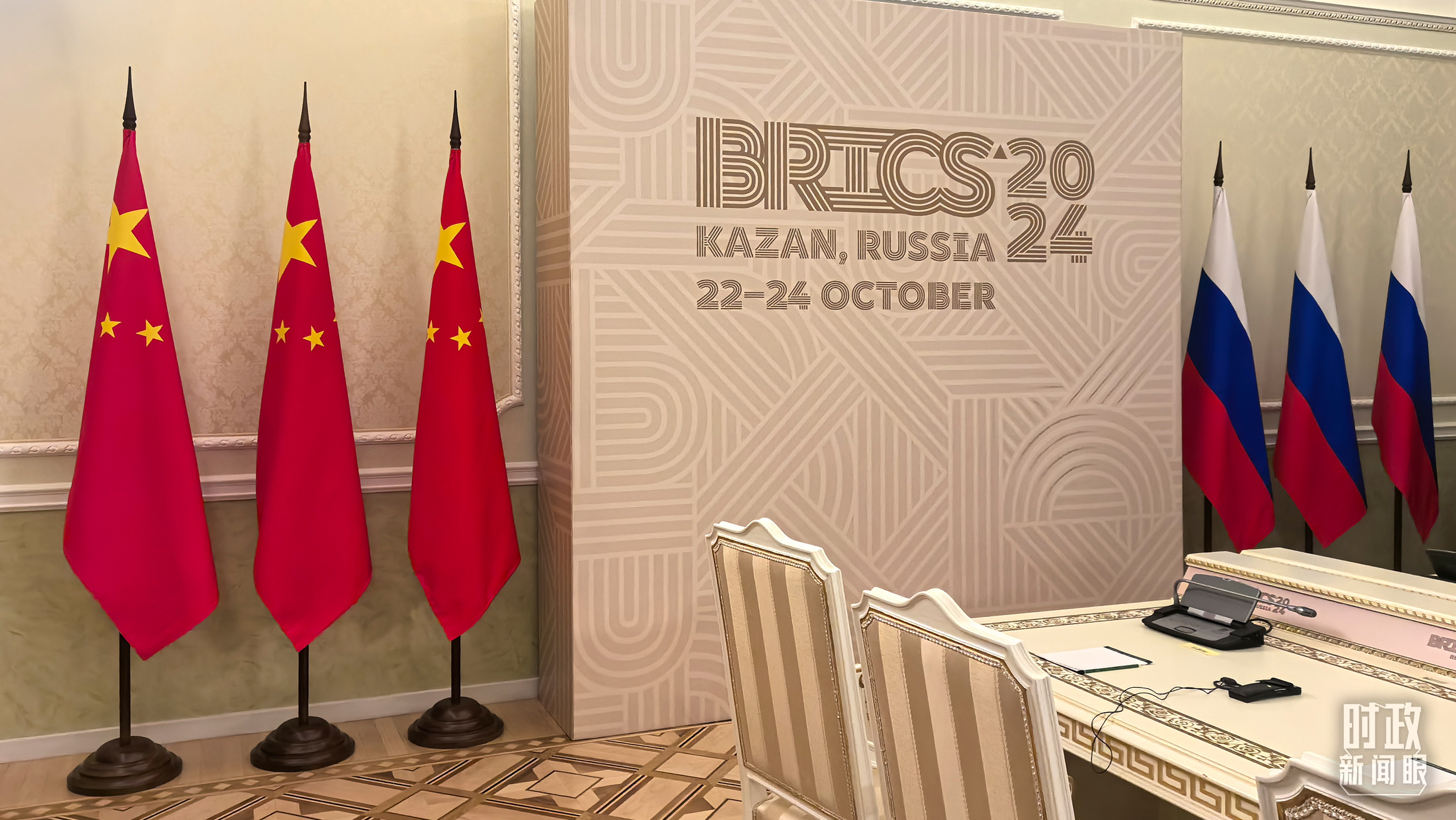 中俄兩國元首喀山會(huì)晤開始前的現(xiàn)場(chǎng)。(總臺(tái)央視記者程鋮拍攝)